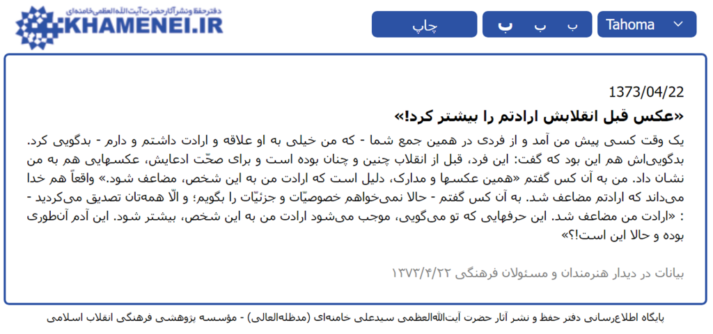 «۱۳ بهمن اولین مصاحبه مطبوعاتی امام بود و همه صحبت‌ها این بود که “جمهوری اسلامی یعنی چی؟ از کجا شما می‌خواهید دولت را تغذیه کنید؟” همه سوالات اینجوری بود. به عنوان یک جوان ۲۶ ساله من احساس می‌کردم یک کودتایی آمریکایی‌ها می‌خوان انجام بدن و امام اکه اینجا یک نهیبی بزنه خوبه. خبرنگار CBS بعد از یک ساعت برگشت به من گفت که سوال خوب نداری؟ من گفتم چرا! بپرسید از امام که اگر لازم باشد حکم جهاد میده؟ امام در جواب گفتند که بله اگه لازم باشد حکم جهاد می‌دهم. این تیتر تمام روزنامه‌های روز بعد شد. و امروزم اگر شما نگاه کنید چهارده بهمن همه روزنامه‌های داخلی تیتر اینه! اون روز بزرگترین درس رسانه‌ای خود را گرفتم! که انقلاب اسلامی عرصه ایست که هر کسی می‌تواند کمک کند، فقط کافیست بداند چیکار باید کند. یک مورچه می‌تواند کاری کند، یک فرد ناشناس می‌تواند کاری کند و تا به امروز هم اینجوری بوده که چقدر آدم‌های ناشناس کارای بزرگ تو این انقلاب کردند که اصلا کسی نمی‌داند که کی هستند و چی هستند و کدام مقطع این کار شد. خیلی از شهدا اینجوری هستند. کسی حتی نمی‌داند که اینها اصلا اینا چیکار کردند!»