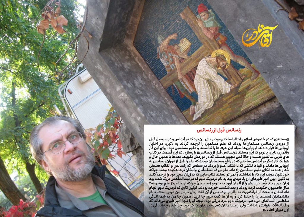 مستندی که در خصوص اسلام و ایتالیا ساختم موضوعش این بود که در آندلس و در سیسیل قبل از دوره‌ی رنسانس مسلمان‌ها بودند که علم مسلمین را ترجمه کردند به لاتین، در اختیار اروپایی‌ها قرار دادند. اروپایی‌ها سواد این حرف‌ها را نداشتند و علوم مسلمین بود. برای این کار رفتم رم، ناپل، پالرمو که این مستند «رنسانس قبل از رنسانس» را بسازم. کلا این قسمت در کتاب‌های غربی سانسور هست و حالا کمی مجبور هستند که در موردش بگویند. بعدها با همین حال و هوا یک کار دیگر در آندلس ساختم که در واقع مسلمانان بودند که علم را قبل از دوران رنسانس به اروپایی‌ها دادند و آنها‌ها با تلاشی که داشتند، علم را بردند در سطحی که رنسانس و انقلاب صنعتی شد و همه به اتکای علوم مسلمین رخ داد. علومی که مسلمانان برایشان ترجمه کرده بودند چراکه خودشون عرضه‌ این کار را نداشتند و نمی‌توانستند کتاب‌هایی که به زبان عربی بود را ترجمه کنند به لاتین. بین امپراتورهای اروپا، فردی بود به نام فردریک دوم که در بیت‌المقدس بزرگ شده بود زبان عربی بلد بود. دربارش را از آلمان آورد به پالرمو (سیسیل) چراکه اونجا مرکز علم بود و ۲۰۰ سال فاطمیون حکومت کرده بودند و بعد شکست خورده بودند. اولین کاری که فردریک دوم انجام داد انتقال پایتخت از فرانکفورت به پالرمو بود. پس از آن گفت زبان دربار من عربی است. تمام دانشمندان (مسلمان) را حفظ کرد و به آن‌ها گفت هیچ جا نرید، همین جا من به شما زندگی سلطنتی افسانه‌ای می‌دهم. فردریک دوم مرد بزرگی بود، نیچه او را تنها امپراطوری می‌داند که واقعاً لیاقت عنوانش را داشت ولی از مسلمانان کسی خبر ندارد که کی بود، چی شد و چه اتفاقی در اون دوران افتاد.